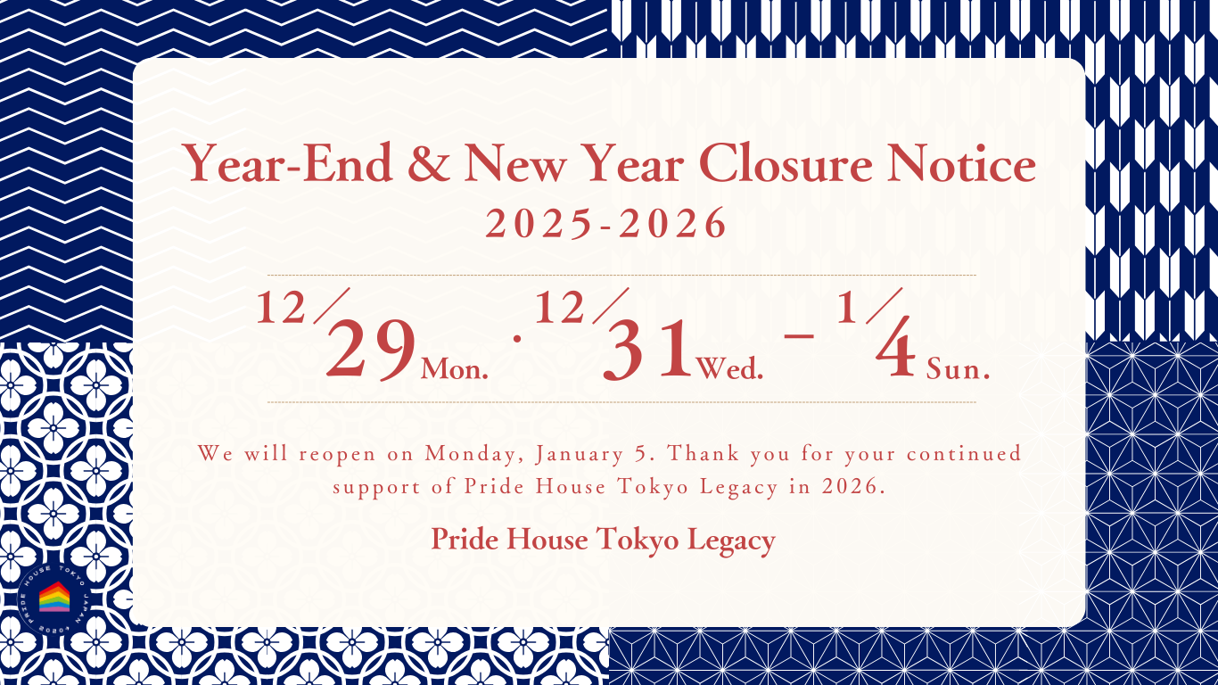 We will reopen on Monday, January 5. Thank you for your continued support of Pride House Tokyo Legacy in 2026.