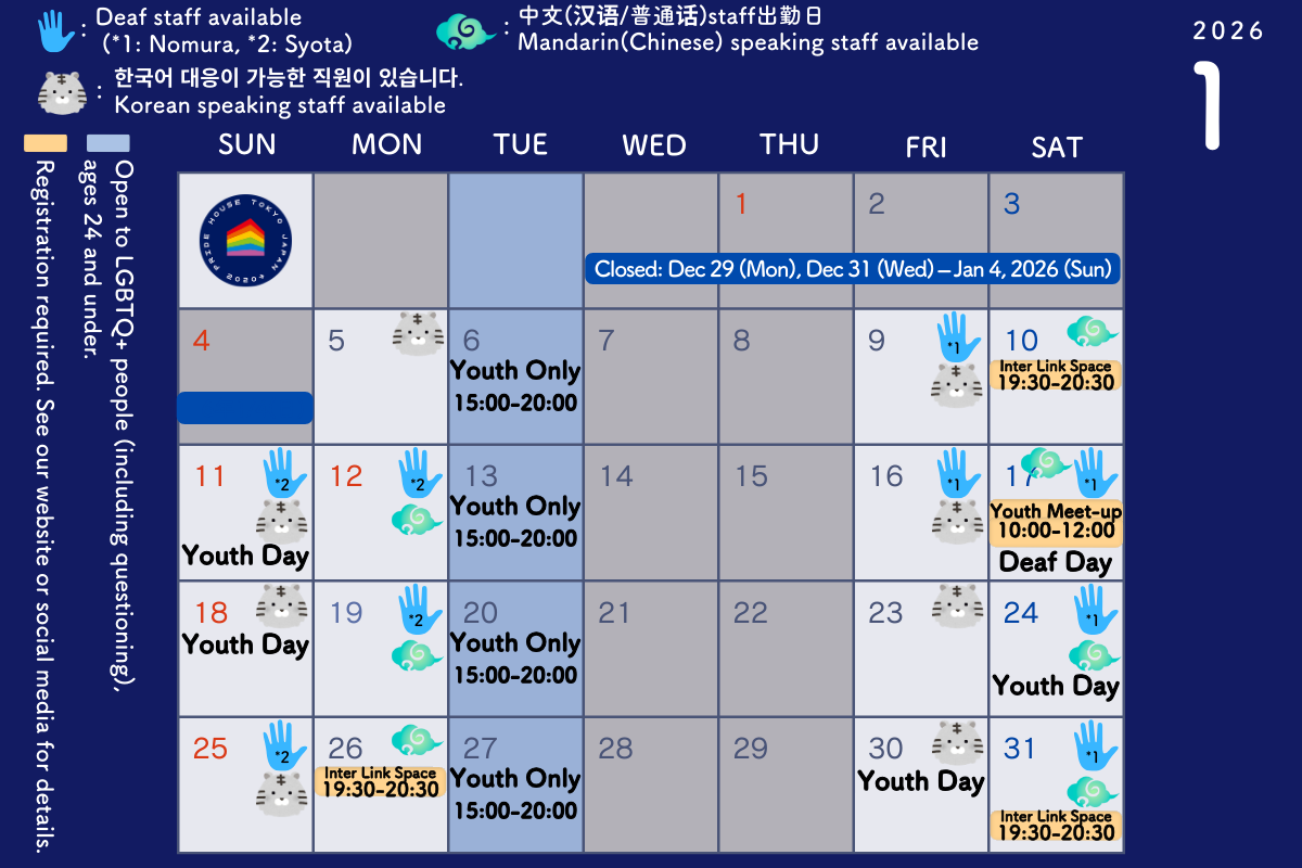 Here is our schedule for January 2026 at Pride House Tokyo Legacy. For details, please check our website’s “Information・Event” page or our social media.