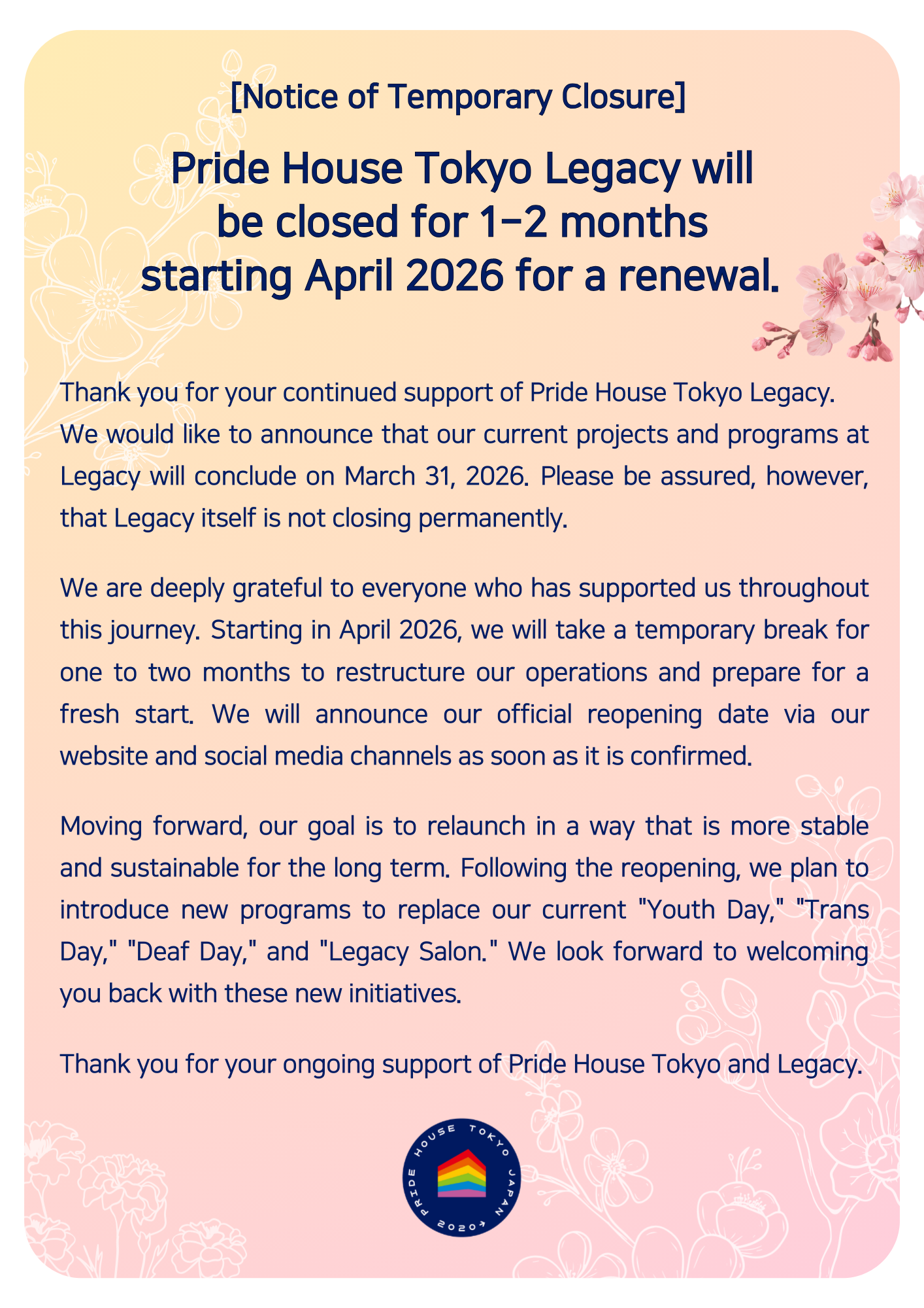 Pride House Tokyo Legacy will be closed for 1-2 months starting April 2026 for a renewal.