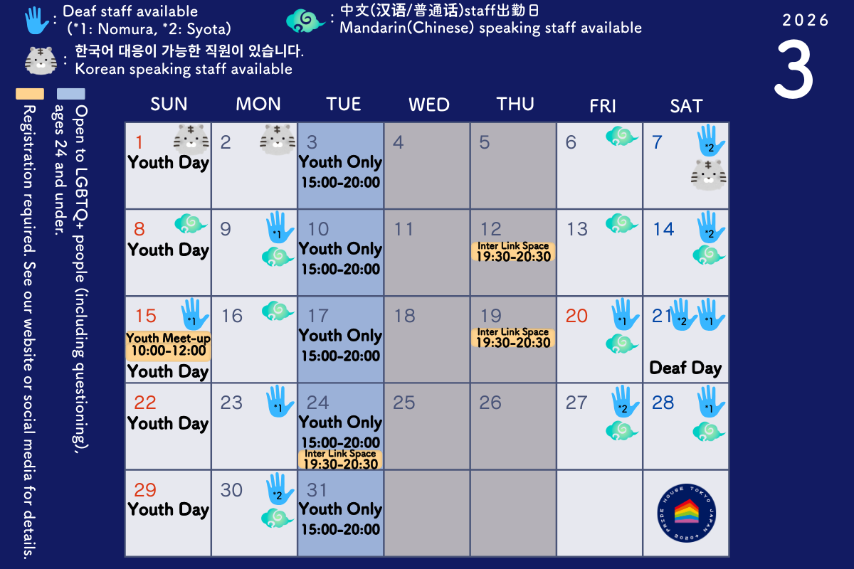 Here is our schedule for March 2026 at Pride House Tokyo Legacy. For details, please check our website’s “Information・Event” page or our social media.